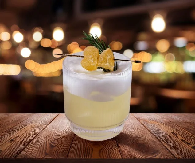 Gin, Ginger Liqueur, Honey, Lemon, Contains egg white (for silky foam) vegan alternative available