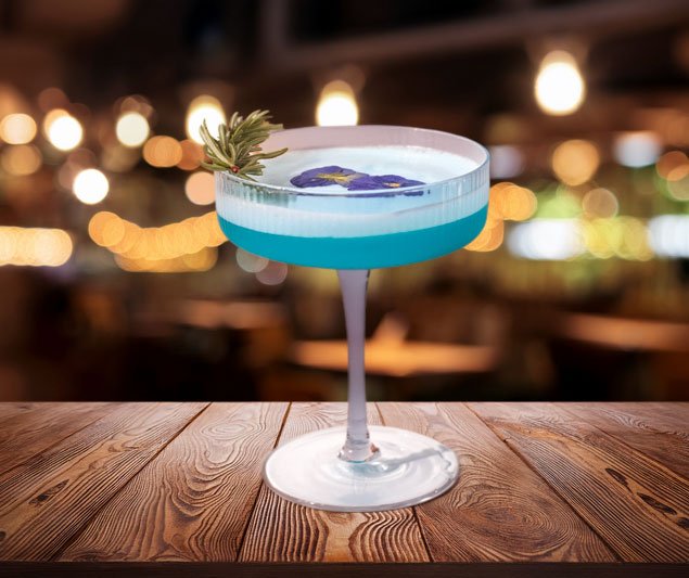 Gin, Blue curacao , Syrup, Lemon, Contains egg white (for silky foam) vegan alternative available